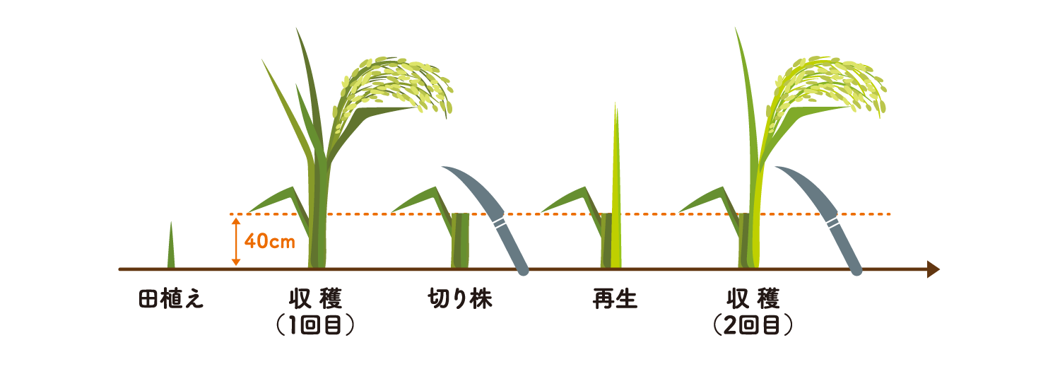 一期作目の収穫の後、刈り取った稲(地際から40cm残す)の切り株から茎を再生させて、もう一度稲穂を実らせて2回目の収穫を行う二期作目の育苗や移植が不要となる画期的な栽培技術です。
